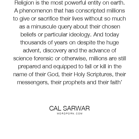 Religion is the most powerful entity on earth. A phenomenon that has conscripted millions to give or sacrifice their lives without so much as a minuscule query about their chosen beliefs or particular ideology. And today thousands of years on despite the huge advent, discovery and the advance of science forensic or otherwise, millions are still prepared and equipped to fall or kill in the name of their God, their Holy Scriptures, their messengers, their prophets and their faith’