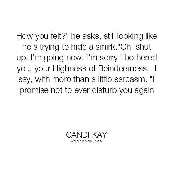 How you felt?" he asks, still looking like he's trying to hide a smirk."Oh, shut up. I'm going now. I'm sorry I bothered you, your Highness of Reindeerness," I say, with more than a little sarcasm. "I promise not to ever disturb you again