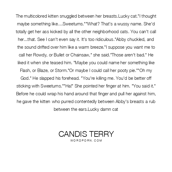 The multicolored kitten snuggled between her breasts.Lucky cat."I thought maybe something like....Sweetums.""What? That's a wussy name. She'd totally get her ass kicked by all the other neighborhood cats. You can't call her...that. See I can't even say it. It's too ridiculous."Abby chuckled, and the sound drifted over him like a warm breeze."I suppose you want me to call her Rowdy, or Bullet or Chainsaw," she said."Those aren't bad." He liked it when she teased him. "Maybe you could name her something like Flash, or Blaze, or Storm."Or maybe I could call her pooty pie.""Oh my God." He slapped his forehead. "You're killing me. You'd be better off sticking with Sweetums.""Ha!" She pointed her finger at him. "You said it." Before he could wrap his hand around that finger and pull her against him, he gave the kitten-who purred contentedly between Abby's breasts-a rub between the ears.Lucky damn cat