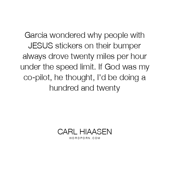 Garcia wondered why people with JESUS stickers on their bumper always drove twenty miles per hour under the speed limit. If God was my co-pilot, he thought, I'd be doing a hundred and twenty