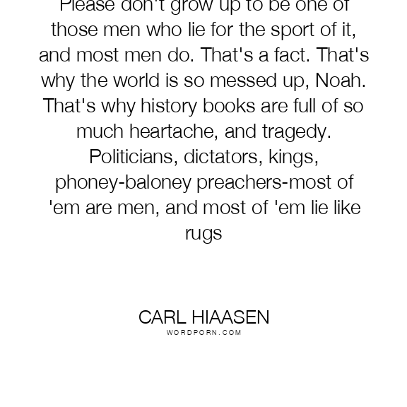 Please don't grow up to be one of those men who lie for the sport of it, and most men do. That's a fact. That's why the world is so messed up, Noah. That's why history books are full of so much heartache, and tragedy. Politicians, dictators, kings, phoney-baloney preachers-most of 'em are men, and most of 'em lie like rugs