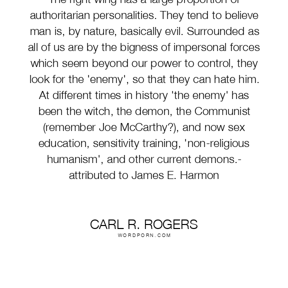 The right wing has a large proportion of authoritarian personalities. They tend to believe man is, by nature, basically evil. Surrounded as all of us are by the bigness of impersonal forces which seem beyond our power to control, they look for the 'enemy', so that they can hate him. At different times in history 'the enemy' has been the witch, the demon, the Communist (remember Joe McCarthy?), and now sex education, sensitivity training, 'non-religious humanism', and other current demons.- attributed to James E. Harmon