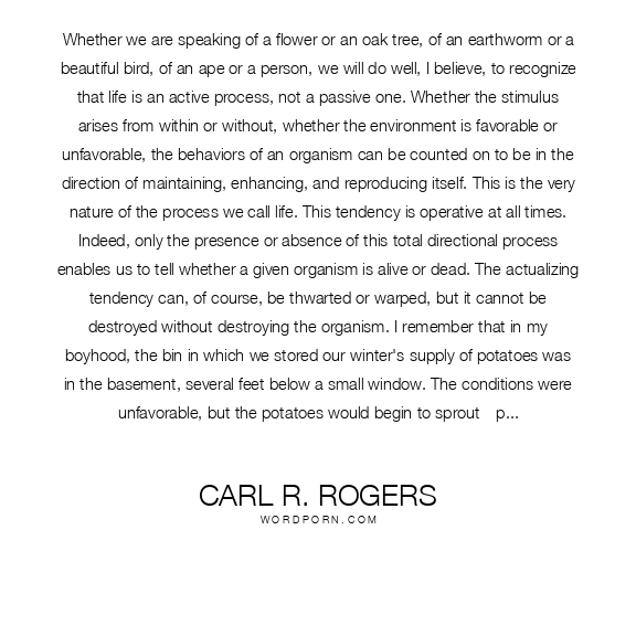 Whether we are speaking of a flower or an oak tree, of an earthworm or a beautiful bird, of an ape or a person, we will do well, I believe, to recognize that life is an active process, not a passive one. Whether the stimulus arises from within or without, whether the environment is favorable or unfavorable, the behaviors of an organism can be counted on to be in the direction of maintaining, enhancing, and reproducing itself. This is the very nature of the process we call life. This tendency is operative at all times. Indeed, only the presence or absence of this total directional process enables us to tell whether a given organism is alive or dead. The actualizing tendency can, of course, be thwarted or warped, but it cannot be destroyed without destroying the organism. I remember that in my boyhood, the bin in which we stored our winter's supply of potatoes was in the basement, several feet below a small window. The conditions were unfavorable, but the potatoes would begin to sprout—pale white sprouts, so unlike the healthy green shoots they sent up when planted in the soil in the spring. But these sad, spindly sprouts would grow 2 or 3 feet in length as they reached toward the distant light of the window. The sprouts were, in their bizarre, futile growth, a sort of desperate expression of the directional tendency I have been describing. They would never become plants, never mature, never fulfill their real potential. But under the most adverse circumstances, they were striving to become. Life would not give up, even if it could not flourish. In dealing with clients whose lives have been terribly warped, in working with men and women on the back wards of state hospitals, I often think of those potato sprouts. So unfavorable have been the conditions in which these people have developed that their lives often seem abnormal, twisted, scarcely human. Yet, the directional tendency in them can be trusted. The clue to understanding their behavior is that they are striving, in the only ways that they perceive as available to them, to move toward growth, toward becoming. To healthy persons, the results may seem bizarre and futile, but they are life's desperate attempt to become itself. This potent constructive tendency is an underlying basis of the person-centered approach