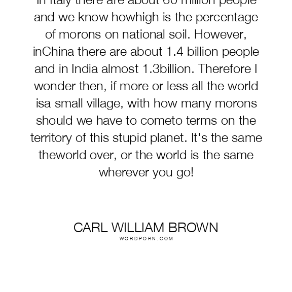 In Italy there are about 60 million people and we know howhigh is the percentage of morons on national soil. However, inChina there are about 1.4 billion people and in India almost 1.3billion. Therefore I wonder then, if more or less all the world isa small village, with how many morons should we have to cometo terms on the territory of this stupid planet. It's the same theworld over, or the world is the same wherever you go!