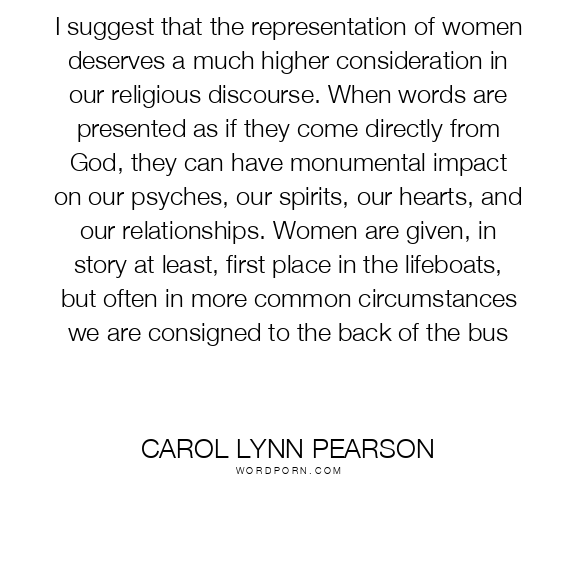 I suggest that the representation of women deserves a much higher consideration in our religious discourse. When words are presented as if they come directly from God, they can have monumental impact on our psyches, our spirits, our hearts, and our relationships. Women are given, in story at least, first place in the lifeboats, but often in more common circumstances we are consigned to the back of the bus