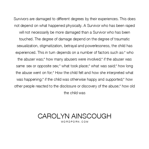 Survivors are damaged to different degrees by their experiences. This does not depend on what happened physically. A Survivor who has been raped will not necessarily be more damaged than a Survivor who has been touched. The degree of damage depend on the degree of traumatic sexualization, stigmatization, betrayal and powerlessness, the child has experienced. This in turn depends on a number of factors such as:* who the abuser was;* how many abusers were involved;* if the abuser was same-sex or opposite sex;* what took place;* what was said;* how long the abuse went on for;* How the child felt and how she interpreted what was happening;* if the child was otherwise happy and supported;* how other people reacted to the disclosure or discovery of the abuse;* how old the child was