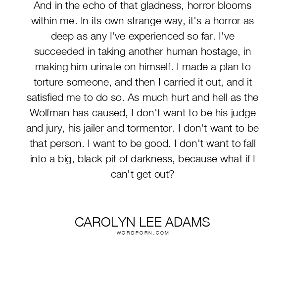 And in the echo of that gladness, horror blooms within me. In its own strange way, it's a horror as deep as any I've experienced so far. I've succeeded in taking another human hostage, in making him urinate on himself. I made a plan to torture someone, and then I carried it out, and it satisfied me to do so. As much hurt and hell as the Wolfman has caused, I don't want to be his judge and jury, his jailer and tormentor. I don't want to be that person. I want to be good. I don't want to fall into a big, black pit of darkness, because what if I can't get out?