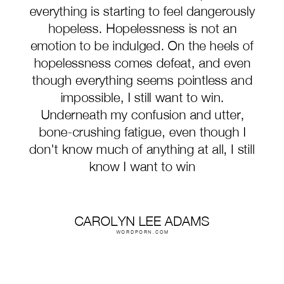 I have no idea what to do, and everything is starting to feel dangerously hopeless. Hopelessness is not an emotion to be indulged. On the heels of hopelessness comes defeat, and even though everything seems pointless and impossible, I still want to win. Underneath my confusion and utter, bone-crushing fatigue, even though I don't know much of anything at all, I still know I want to win