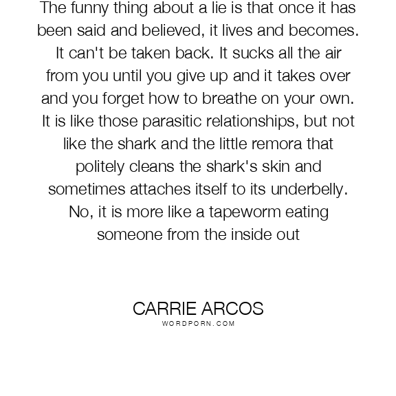 The funny thing about a lie is that once it has been said and believed, it lives and becomes. It can't be taken back. It sucks all the air from you until you give up and it takes over and you forget how to breathe on your own. It is like those parasitic relationships, but not like the shark and the little remora that politely cleans the shark's skin and sometimes attaches itself to its underbelly. No, it is more like a tapeworm eating someone from the inside out