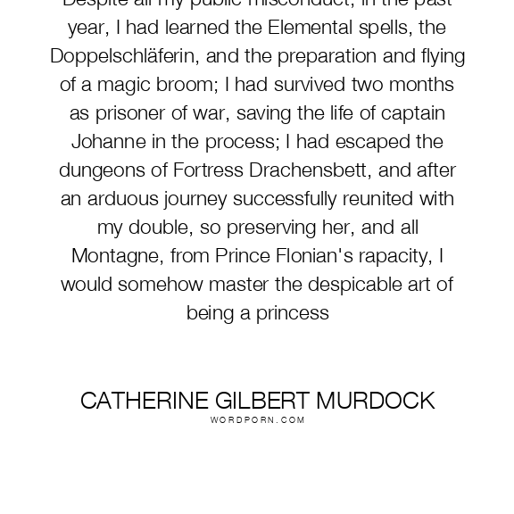 Despite all my public misconduct, in the past year, I had learned the Elemental spells, the Doppelschläferin, and the preparation and flying of a magic broom; I had survived two months as prisoner of war, saving the life of captain Johanne in the process; I had escaped the dungeons of Fortress Drachensbett, and after an arduous journey successfully reunited with my double, so preserving her, and all Montagne, from Prince Flonian's rapacity, I would somehow master the despicable art of being a princess
