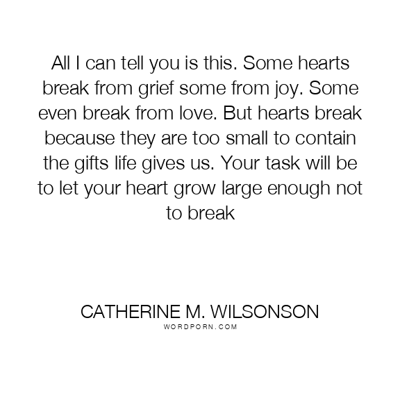 All I can tell you is this. Some hearts break from grief some from joy. Some even break from love. But hearts break because they are too small to contain the gifts life gives us. Your task will be to let your heart grow large enough not to break