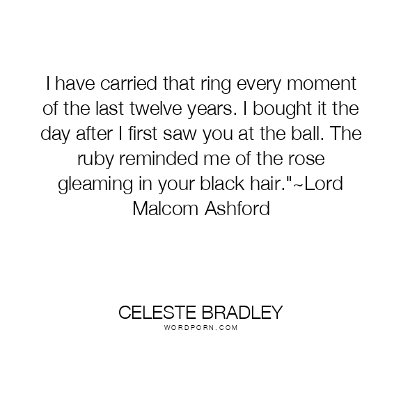 I have carried that ring every moment of the last twelve years. I bought it the day after I first saw you at the ball. The ruby reminded me of the rose gleaming in your black hair."~Lord Malcom Ashford