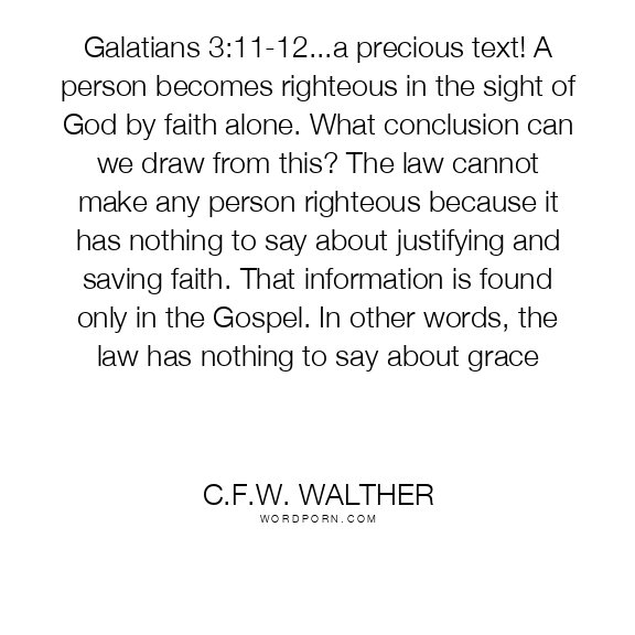 Galatians 3:11-12...a precious text! A person becomes righteous in the sight of God by faith alone. What conclusion can we draw from this? The law cannot make any person righteous because it has nothing to say about justifying and saving faith. That information is found only in the Gospel. In other words, the law has nothing to say about grace