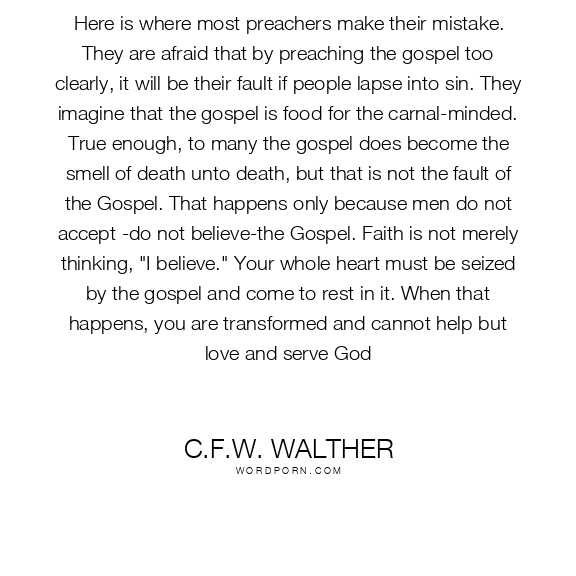 Here is where most preachers make their mistake. They are afraid that by preaching the gospel too clearly, it will be their fault if people lapse into sin. They imagine that the gospel is food for the carnal-minded. True enough, to many the gospel does become the smell of death unto death, but that is not the fault of the Gospel. That happens only because men do not accept -do not believe-the Gospel. Faith is not merely thinking, "I believe." Your whole heart must be seized by the gospel and come to rest in it. When that happens, you are transformed and cannot help but love and serve God