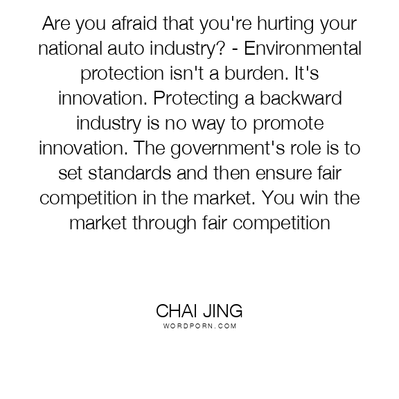 Are you afraid that you're hurting your national auto industry? - Environmental protection isn't a burden. It's innovation. Protecting a backward industry is no way to promote innovation. The government's role is to set standards and then ensure fair competition in the market. You win the market through fair competition
