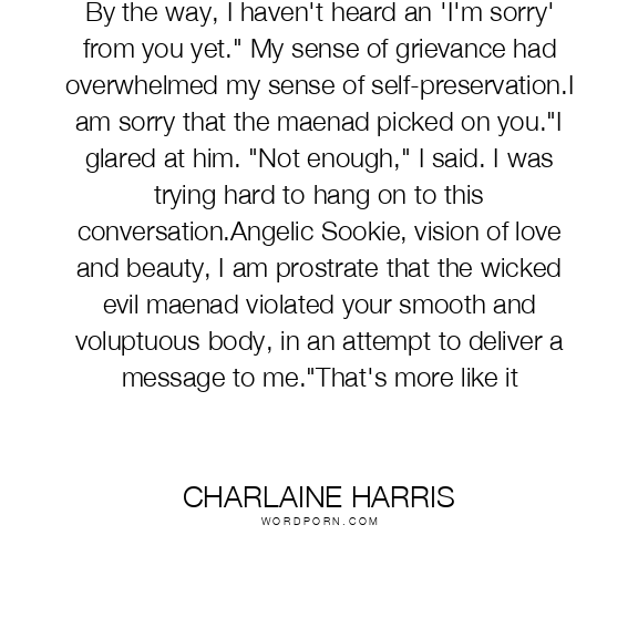 By the way, I haven't heard an 'I'm sorry' from you yet." My sense of grievance had overwhelmed my sense of self-preservation.I am sorry that the maenad picked on you."I glared at him. "Not enough," I said. I was trying hard to hang on to this conversation.Angelic Sookie, vision of love and beauty, I am prostrate that the wicked evil maenad violated your smooth and voluptuous body, in an attempt to deliver a message to me."That's more like it