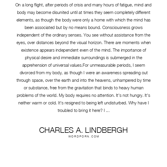 On a long flight, after periods of crisis and many hours of fatigue, mind and body may become disunited until at times they seem completely different elements, as though the body were only a home with which the mind has been associated but by no means bound. Consciousness grows independent of the ordinary senses. You see without assistance from the eyes, over distances beyond the visual horizon. There are moments when existence appears independent even of the mind. The importance of physical desire and immediate surroundings is submerged in the apprehension of universal values.For unmeasurable periods, I seem divorced from my body, as though I were an awareness spreading out through space, over the earth and into the heavens, unhampered by time or substance, free from the gravitation that binds to heavy human problems of the world. My body requires no attention. It's not hungry. It's neither warm or cold. It's resigned to being left undisturbed. Why have I troubled to bring it here? I might better have left it back at Long Island or St. Louis, while the weightless element that has lived within it flashes through the skies and views the planet. This essential consciousness needs no body for its travels. It needs no plane, no engine, no instruments, only the release from flesh which circumstances I've gone through make possible.Then what am I – the body substance which I can see with my eyes and feel with my hands? Or am I this realization, this greater understanding which dwells within it, yet expands through the universe outside; a part of all existence, powerless but without need for power; immersed in solitude, yet in contact with all creation? There are moments when the two appear inseparable, and others when they could be cut apart by the merest flash of light.While my hand is on the stick, my feet on the rudder, and my eyes on the compass, this consciousness, like a winged messenger, goes out to visit the waves below, testing the warmth of water, the speed of wind, the thickness of intervening clouds. It goes north to the glacial coasts of Greenland, over the horizon to the edge of dawn, ahead to Ireland, England, and the continent of Europe, away through space to the moon and stars, always returning, unwillingly, to the mortal duty of seeing that the limbs and muscles have attended their routine while it was gone