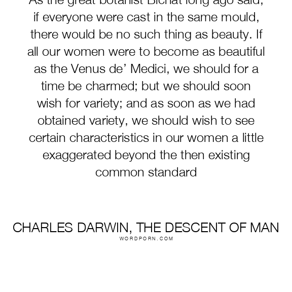 As the great botanist Bichat long ago said, if everyone were cast in the same mould, there would be no such thing as beauty. If all our women were to become as beautiful as the Venus de’ Medici, we should for a time be charmed; but we should soon wish for variety; and as soon as we had obtained variety, we should wish to see certain characteristics in our women a little exaggerated beyond the then existing common standard
