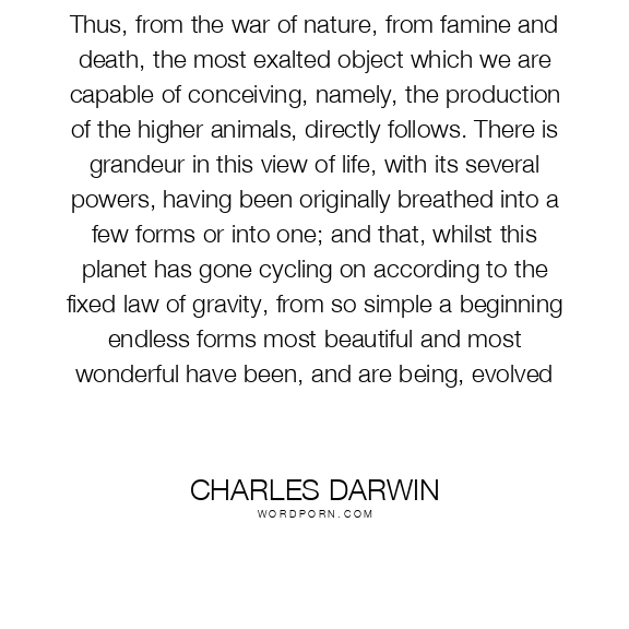 Thus, from the war of nature, from famine and death, the most exalted object which we are capable of conceiving, namely, the production of the higher animals, directly follows. There is grandeur in this view of life, with its several powers, having been originally breathed into a few forms or into one; and that, whilst this planet has gone cycling on according to the fixed law of gravity, from so simple a beginning endless forms most beautiful and most wonderful have been, and are being, evolved