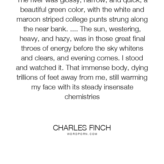 The river was glossy, narrow, and quick, a beautiful green color, with the white and maroon striped college punts strung along the near bank. .... The sun, westering, heavy, and hazy, was in those great final throes of energy before the sky whitens and clears, and evening comes. I stood and watched it. That immense body, dying trillions of feet away from me, still warming my face with its steady insensate chemistries