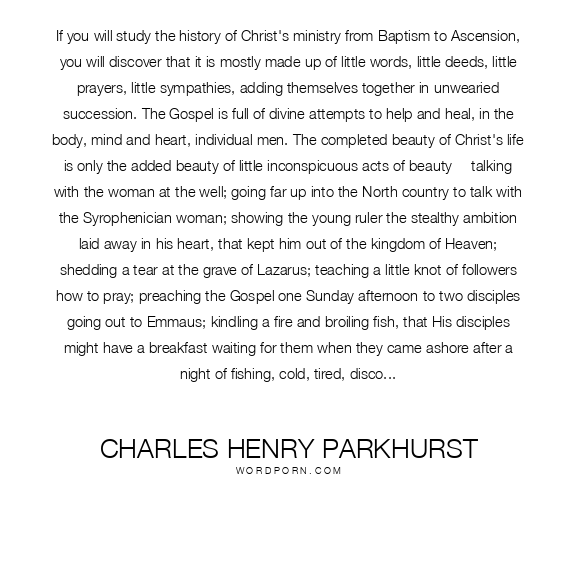 If you will study the history of Christ's ministry from Baptism to Ascension, you will discover that it is mostly made up of little words, little deeds, little prayers, little sympathies, adding themselves together in unwearied succession. The Gospel is full of divine attempts to help and heal, in the body, mind and heart, individual men. The completed beauty of Christ's life is only the added beauty of little inconspicuous acts of beauty -- talking with the woman at the well; going far up into the North country to talk with the Syrophenician woman; showing the young ruler the stealthy ambition laid away in his heart, that kept him out of the kingdom of Heaven; shedding a tear at the grave of Lazarus; teaching a little knot of followers how to pray; preaching the Gospel one Sunday afternoon to two disciples going out to Emmaus; kindling a fire and broiling fish, that His disciples might have a breakfast waiting for them when they came ashore after a night of fishing, cold, tired, discouraged. All of these things, you see, let us in so easily into the real quality and tone of God's interests, so specific, so narrowed down, so enlisted in what is small, so engrossed in what is minute