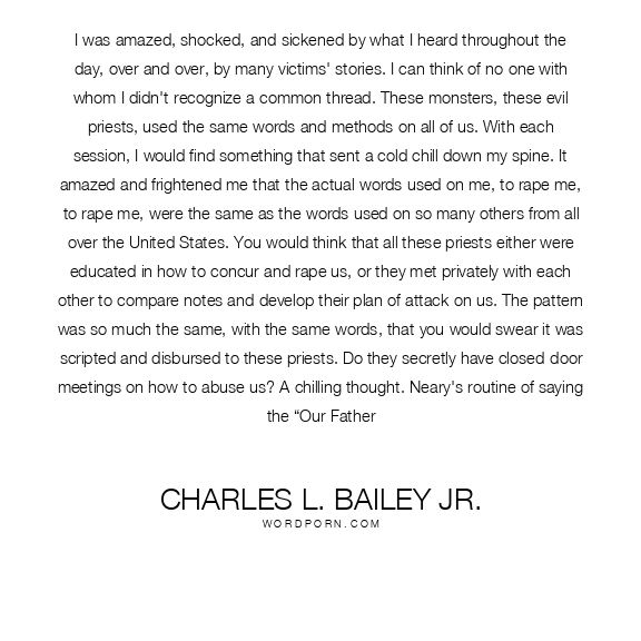 I was amazed, shocked, and sickened by what I heard throughout the day, over and over, by many victims' stories. I can think of no one with whom I didn't recognize a common thread. These monsters, these evil priests, used the same words and methods on all of us. With each session, I would find something that sent a cold chill down my spine. It amazed and frightened me that the actual words used on me, to rape me, to rape me, were the same as the words used on so many others from all over the United States. You would think that all these priests either were educated in how to concur and rape us, or they met privately with each other to compare notes and develop their plan of attack on us. The pattern was so much the same, with the same words, that you would swear it was scripted and disbursed to these priests. Do they secretly have closed-door meetings on how to abuse us? A chilling thought. Neary's routine of saying the “Our Father