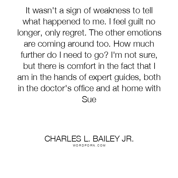 It wasn't a sign of weakness to tell what happened to me. I feel guilt no longer, only regret. The other emotions are coming around too. How much further do I need to go? I'm not sure, but there is comfort in the fact that I am in the hands of expert guides, both in the doctor's office and at home with Sue