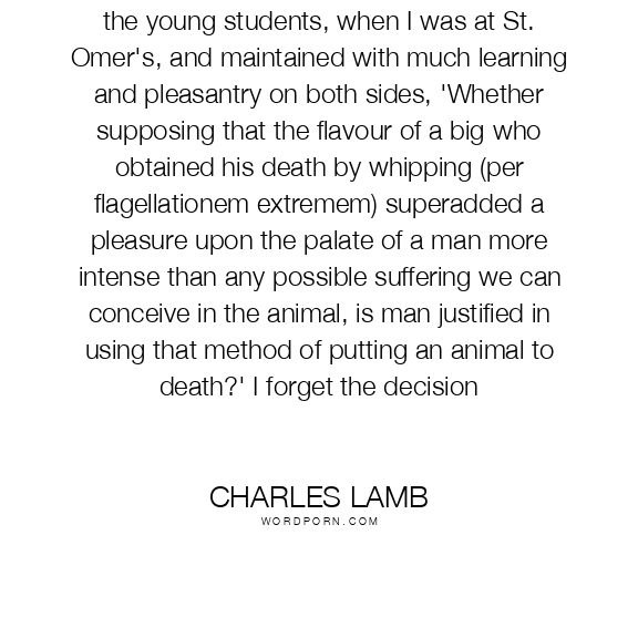 I remember an hypothesis argued upon by the young students, when I was at St. Omer's, and maintained with much learning and pleasantry on both sides, 'Whether supposing that the flavour of a big who obtained his death by whipping (per flagellationem extremem) superadded a pleasure upon the palate of a man more intense than any possible suffering we can conceive in the animal, is man justified in using that method of putting an animal to death?' I forget the decision