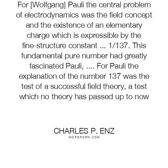 For [Wolfgang] Pauli the central problem of electrodynamics was the field concept and the existence of an elementary charge which is expressible by the fine-structure constant ... 1/137. This fundamental pure number had greatly fascinated Pauli, .... For Pauli the explanation of the number 137 was the test of a successful field theory, a test which no theory has passed up to now