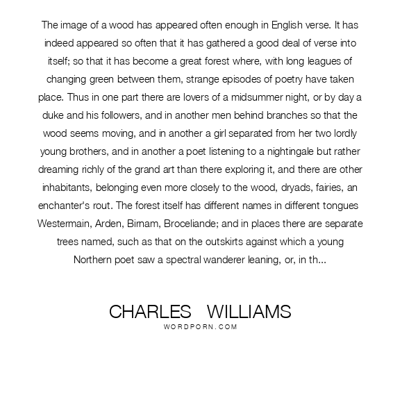 The image of a wood has appeared often enough in English verse. It has indeed appeared so often that it has gathered a good deal of verse into itself; so that it has become a great forest where, with long leagues of changing green between them, strange episodes of poetry have taken place. Thus in one part there are lovers of a midsummer night, or by day a duke and his followers, and in another men behind branches so that the wood seems moving, and in another a girl separated from her two lordly young brothers, and in another a poet listening to a nightingale but rather dreaming richly of the grand art than there exploring it, and there are other inhabitants, belonging even more closely to the wood, dryads, fairies, an enchanter's rout. The forest itself has different names in different tongues- Westermain, Arden, Birnam, Broceliande; and in places there are separate trees named, such as that on the outskirts against which a young Northern poet saw a spectral wanderer leaning, or, in the unexplored centre of which only rumours reach even poetry, Igdrasil of one myth, or the Trees of Knowledge and Life of another. So that indeed the whole earth seems to become this one enormous forest, and our longest and most stable civilizations are only clearings in the midst of it