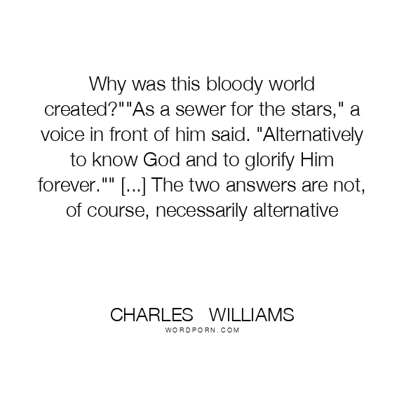 Why was this bloody world created?""As a sewer for the stars," a voice in front of him said. "Alternatively to know God and to glorify Him forever."" [...] The two answers are not, of course, necessarily alternative
