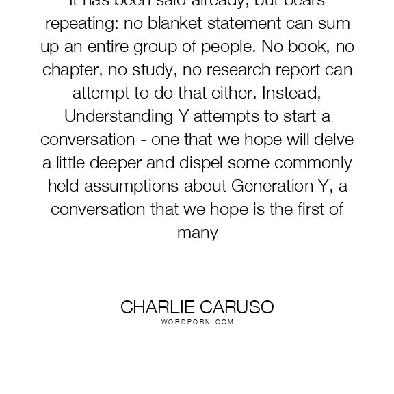 It has been said already, but bears repeating: no blanket statement can sum up an entire group of people. No book, no chapter, no study, no research report can attempt to do that either. Instead, Understanding Y attempts to start a conversation - one that we hope will delve a little deeper and dispel some commonly held assumptions about Generation Y, a conversation that we hope is the first of many