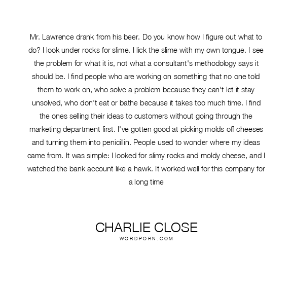Mr. Lawrence drank from his beer. Do you know how I figure out what to do? I look under rocks for slime. I lick the slime with my own tongue. I see the problem for what it is, not what a consultant's methodology says it should be. I find people who are working on something that no one told them to work on, who solve a problem because they can't let it stay unsolved, who don't eat or bathe because it takes too much time. I find the ones selling their ideas to customers without going through the marketing department first. I've gotten good at picking molds off cheeses and turning them into penicillin. People used to wonder where my ideas came from. It was simple: I looked for slimy rocks and moldy cheese, and I watched the bank account like a hawk. It worked well for this company for a long time