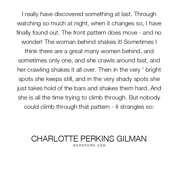 I really have discovered something at last. Through watching so much at night, when it changes so, I have finally found out. The front pattern does move - and no wonder! The woman behind shakes it! Sometimes I think there are a great many women behind, and sometimes only one, and she crawls around fast, and her crawling shakes it all over. Then in the very ' bright spots she keeps still, and in the very shady spots she just takes hold of the bars and shakes them hard. And she is all the time trying to climb through. But nobody could climb through that pattern - it strangles so: