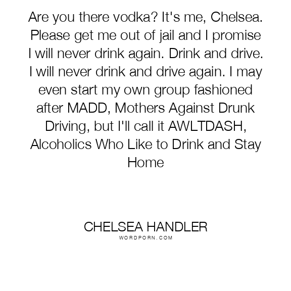 Are you there vodka? It's me, Chelsea. Please get me out of jail and I promise I will never drink again. Drink and drive. I will never drink and drive again. I may even start my own group fashioned after MADD, Mothers Against Drunk Driving, but I'll call it AWLTDASH, Alcoholics Who Like to Drink and Stay Home