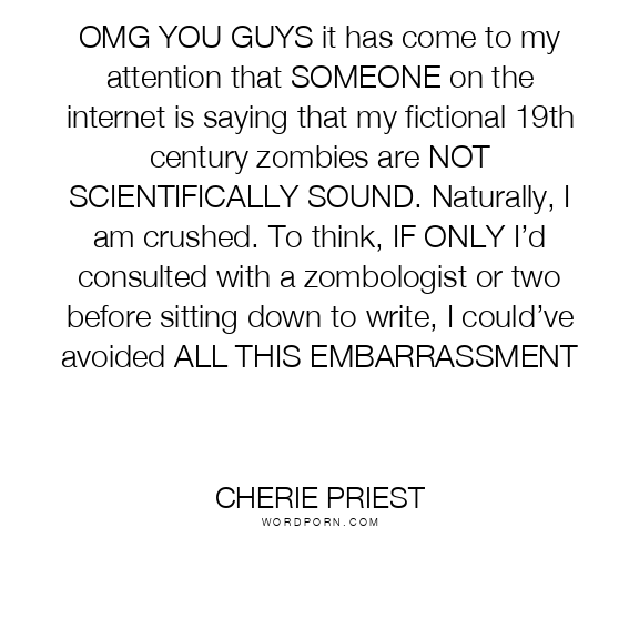 OMG YOU GUYS it has come to my attention that SOMEONE on the internet is saying that my fictional 19th century zombies are NOT SCIENTIFICALLY SOUND. Naturally, I am crushed. To think, IF ONLY I’d consulted with a zombologist or two before sitting down to write, I could’ve avoided ALL THIS EMBARRASSMENT
