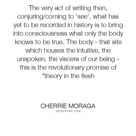The very act of writing then, conjuring/coming to 'see', what has yet to be recorded in history is to bring into consciousness what only the body knows to be true. The body - that site which houses the intuitive, the unspoken, the viscera of our being - this is the revolutionary promise of "theory in the flesh