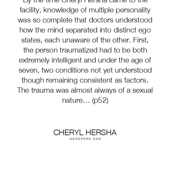 By the time Cheryl Hersha came to the facility, knowledge of multiple personality was so complete that doctors understood how the mind separated into distinct ego states, each unaware of the other. First, the person traumatized had to be both extremely intelligent and under the age of seven, two conditions not yet understood though remaining consistent as factors. The trauma was almost always of a sexual nature… (p52)