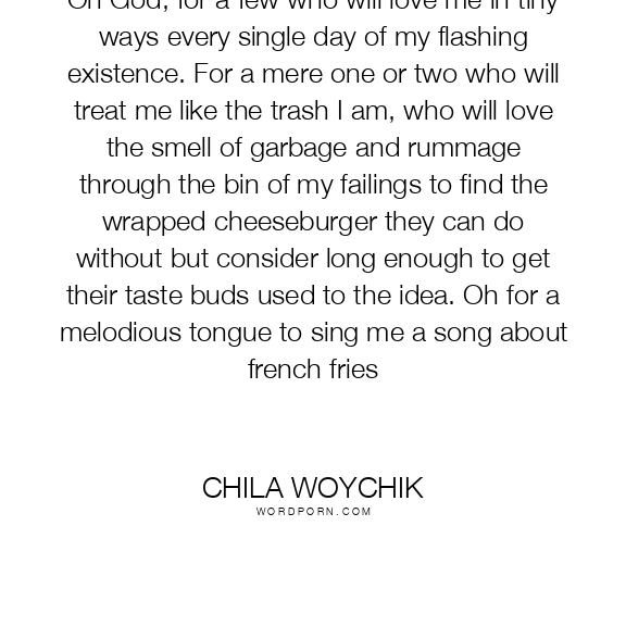 Oh God, for a few who will love me in tiny ways every single day of my flashing existence. For a mere one or two who will treat me like the trash I am, who will love the smell of garbage and rummage through the bin of my failings to find the wrapped cheeseburger they can do without but consider long enough to get their taste buds used to the idea. Oh for a melodious tongue to sing me a song about french fries
