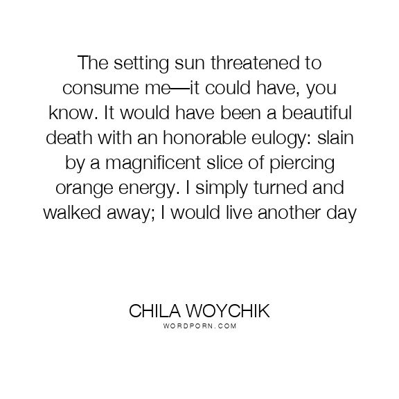 The setting sun threatened to consume me—it could have, you know. It would have been a beautiful death with an honorable eulogy: slain by a magnificent slice of piercing orange energy. I simply turned and walked away; I would live another day