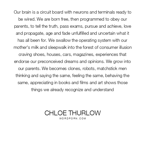 Our brain is a circuit board with neurons and terminals ready to be wired. We are born free, then programmed to obey our parents, to tell the truth, pass exams, pursue and achieve, love and propagate, age and fade unfulfilled and uncertain what it has all been for. We swallow the operating system with our mother's milk and sleepwalk into the forest of consumer illusion craving shoes, houses, cars, magazines, experiences that endorse our preconceived dreams and opinions. We grow into our parents. We becomes clones, robots, matchstick men thinking and saying the same, feeling the same, behaving the same, appreciating in books and films and art shows those things we already recognize and understand