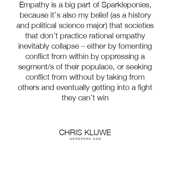Empathy is a big part of Sparkleponies, because it’s also my belief (as a history and political science major) that societies that don’t practice rational empathy inevitably collapse – either by fomenting conflict from within by oppressing a segment/s of their populace, or seeking conflict from without by taking from others and eventually getting into a fight they can’t win