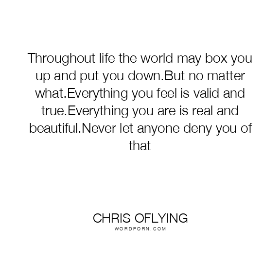 Throughout life the world may box you up and put you down.But no matter what.Everything you feel is valid and true.Everything you are is real and beautiful.Never let anyone deny you of that