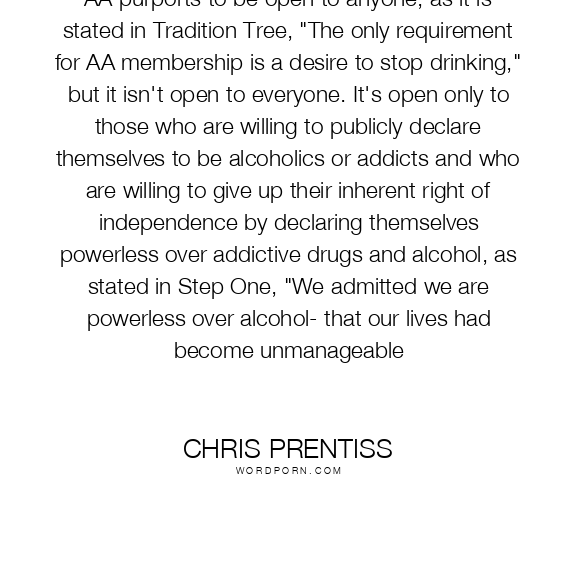 AA purports to be open to anyone, as it is stated in Tradition Tree, "The only requirement for AA membership is a desire to stop drinking," but it isn't open to everyone. It's open only to those who are willing to publicly declare themselves to be alcoholics or addicts and who are willing to give up their inherent right of independence by declaring themselves powerless over addictive drugs and alcohol, as stated in Step One, "We admitted we are powerless over alcohol- that our lives had become unmanageable