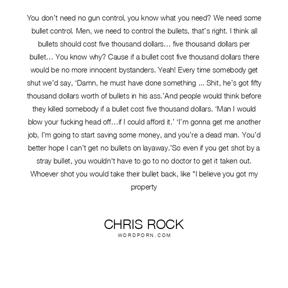 You don’t need no gun control, you know what you need? We need some bullet control. Men, we need to control the bullets, that’s right. I think all bullets should cost five thousand dollars… five thousand dollars per bullet… You know why? Cause if a bullet cost five thousand dollars there would be no more innocent bystanders. Yeah! Every time somebody get shut we’d say, ‘Damn, he must have done something ... Shit, he’s got fifty thousand dollars worth of bullets in his ass.’And people would think before they killed somebody if a bullet cost five thousand dollars. ‘Man I would blow your fucking head off…if I could afford it.’ ‘I’m gonna get me another job, I’m going to start saving some money, and you’re a dead man. You’d better hope I can’t get no bullets on layaway.’So even if you get shot by a stray bullet, you wouldn't have to go to no doctor to get it taken out. Whoever shot you would take their bullet back, like "I believe you got my property