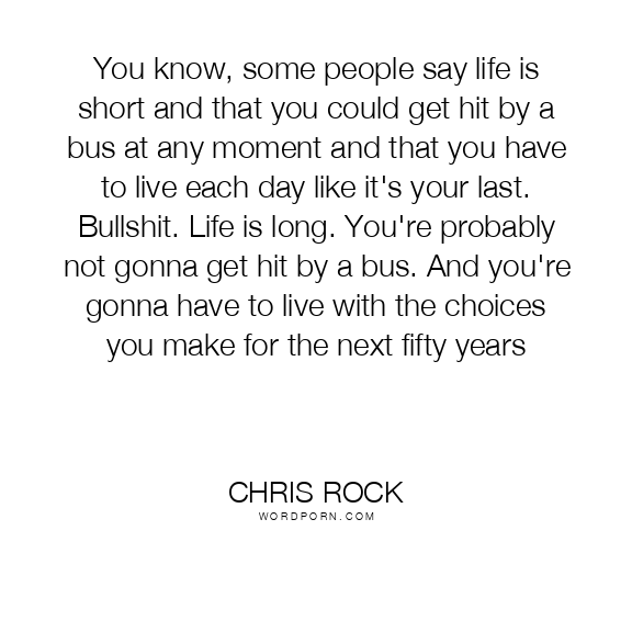 You know, some people say life is short and that you could get hit by a bus at any moment and that you have to live each day like it's your last. Bullshit. Life is long. You're probably not gonna get hit by a bus. And you're gonna have to live with the choices you make for the next fifty years