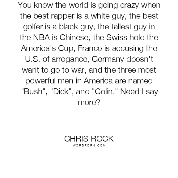 You know the world is going crazy when the best rapper is a white guy, the best golfer is a black guy, the tallest guy in the NBA is Chinese, the Swiss hold the America's Cup, France is accusing the U.S. of arrogance, Germany doesn't want to go to war, and the three most powerful men in America are named "Bush", "Dick", and "Colin." Need I say more?