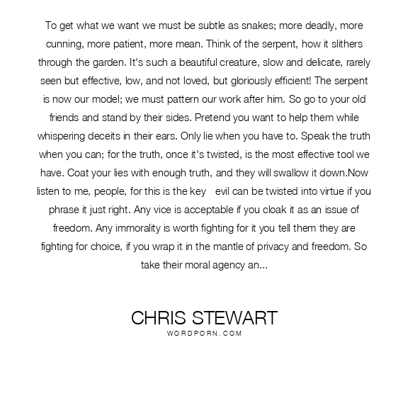To get what we want we must be subtle as snakes; more deadly, more cunning, more patient, more mean. Think of the serpent, how it slithers through the garden. It's such a beautiful creature, slow and delicate, rarely seen but effective, low, and not loved, but gloriously efficient! The serpent is now our model; we must pattern our work after him. So go to your old friends and stand by their sides. Pretend you want to help them while whispering deceits in their ears. Only lie when you have to. Speak the truth when you can; for the truth, once it's twisted, is the most effective tool we have. Coat your lies with enough truth, and they will swallow it down.Now listen to me, people, for this is the key - evil can be twisted into virtue if you phrase it just right. Any vice is acceptable if you cloak it as an issue of freedom. Any immorality is worth fighting for it you tell them they are fighting for choice, if you wrap it in the mantle of privacy and freedom. So take their moral agency and turn it on them. But be patient. . . be patient. . . it takes time to turn the truth upside down