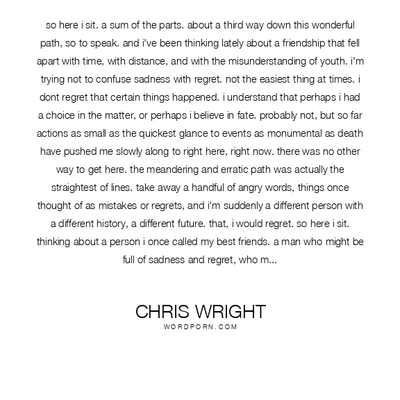 so here i sit. a sum of the parts. about a third way down this wonderful path, so to speak. and i've been thinking lately about a friendship that fell apart with time, with distance, and with the misunderstanding of youth. i'm trying not to confuse sadness with regret. not the easiest thing at times. i dont regret that certain things happened. i understand that perhaps i had a choice in the matter, or perhaps i believe in fate. probably not, but so far actions as small as the quickest glance to events as monumental as death have pushed me slowly along to right here, right now. there was no other way to get here. the meandering and erratic path was actually the straightest of lines. take away a handful of angry words, things once thought of as mistakes or regrets, and i'm suddenly a different person with a different history, a different future. that, i would regret. so here i sit. thinking about a person i once called my best friends. a man who might be full of sadness and regret, who might not give a damn, or who might, just might, remember the future and realize that's where its at