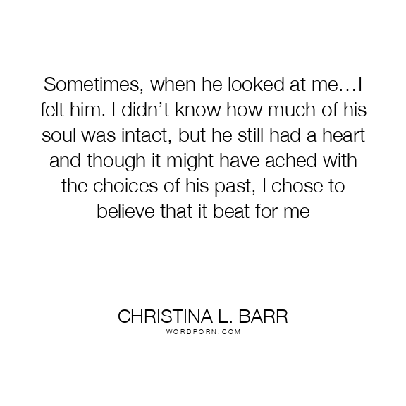 Sometimes, when he looked at me…I felt him. I didn’t know how much of his soul was intact, but he still had a heart and though it might have ached with the choices of his past, I chose to believe that it beat for me